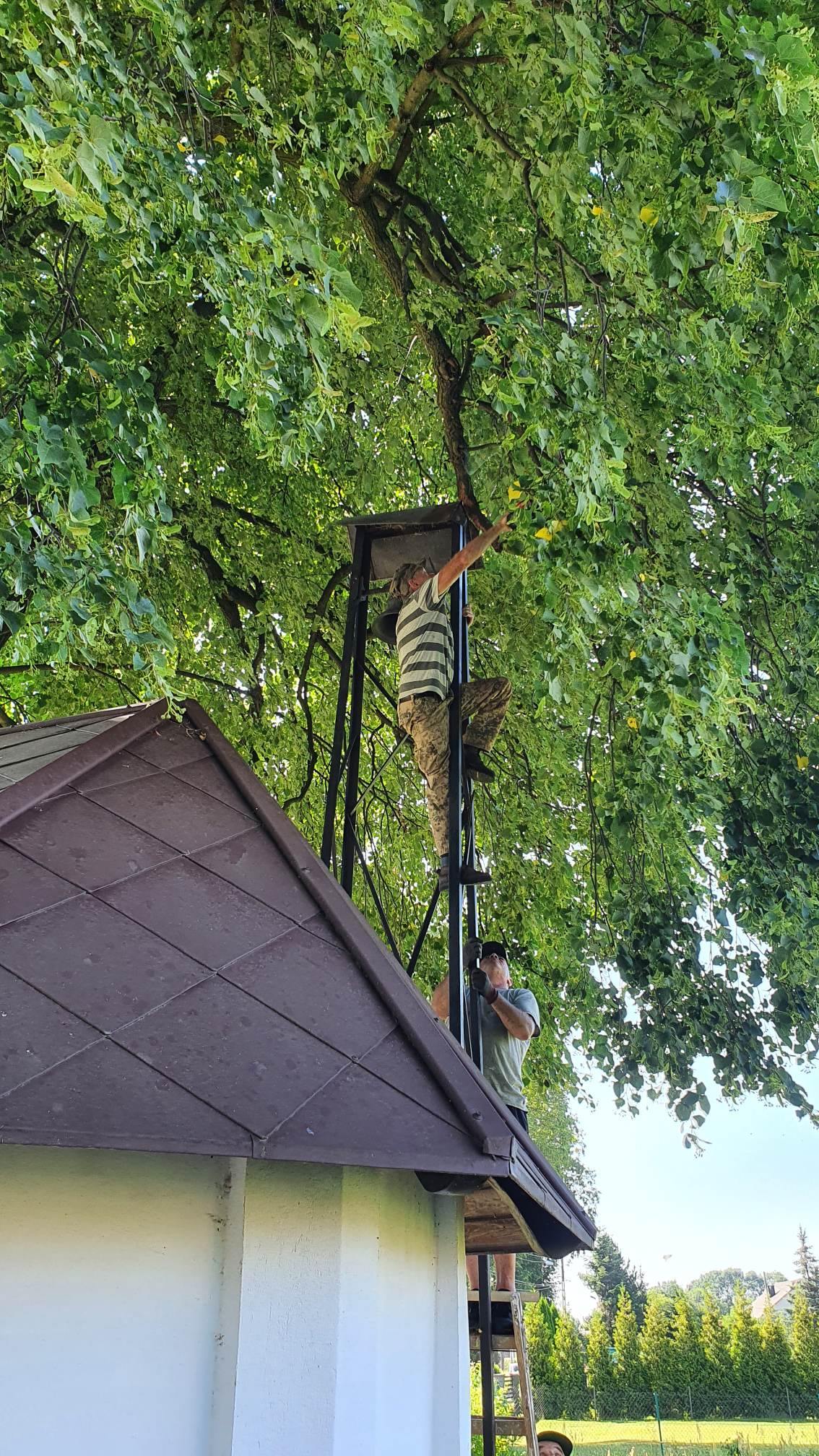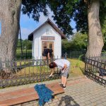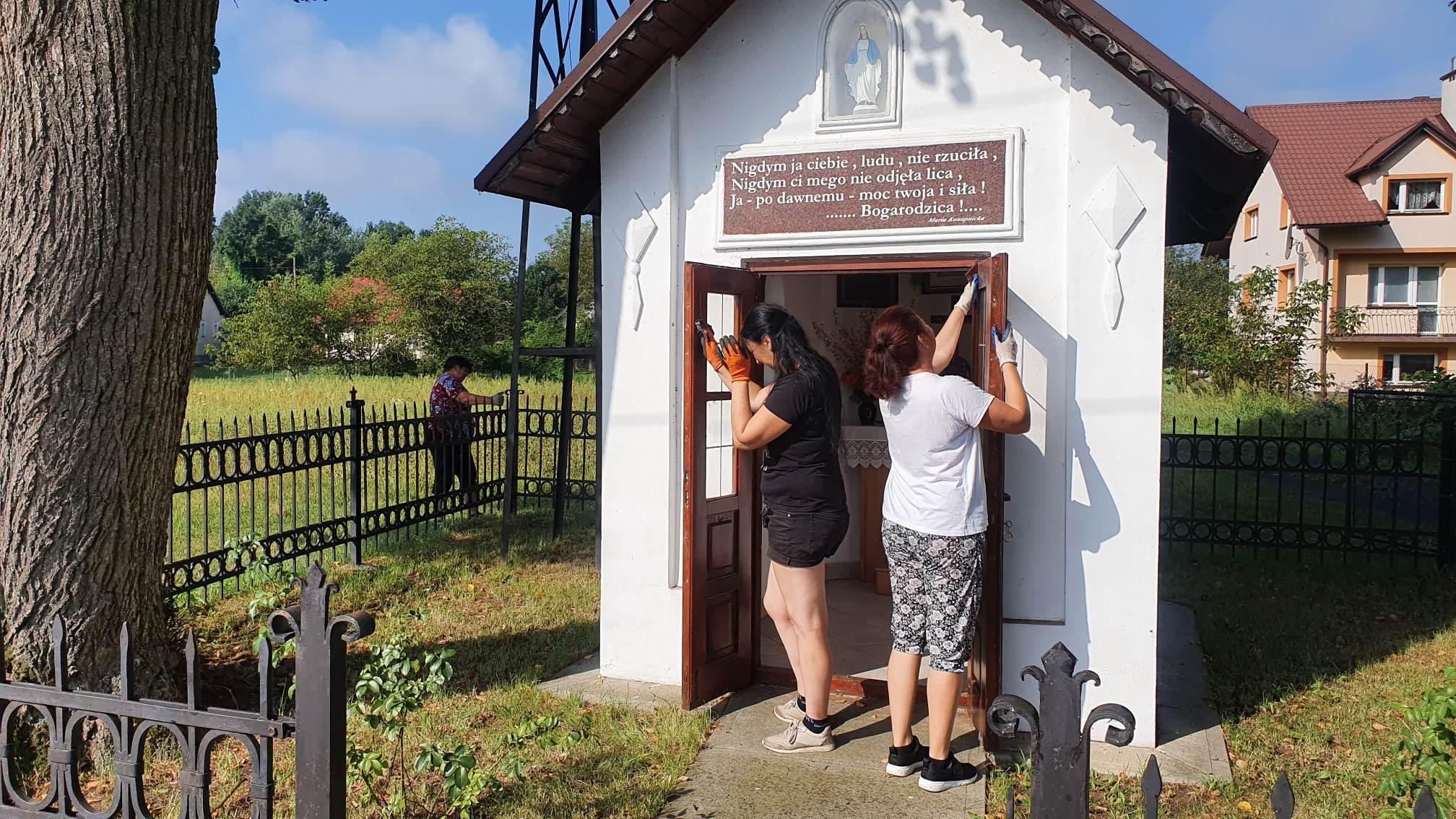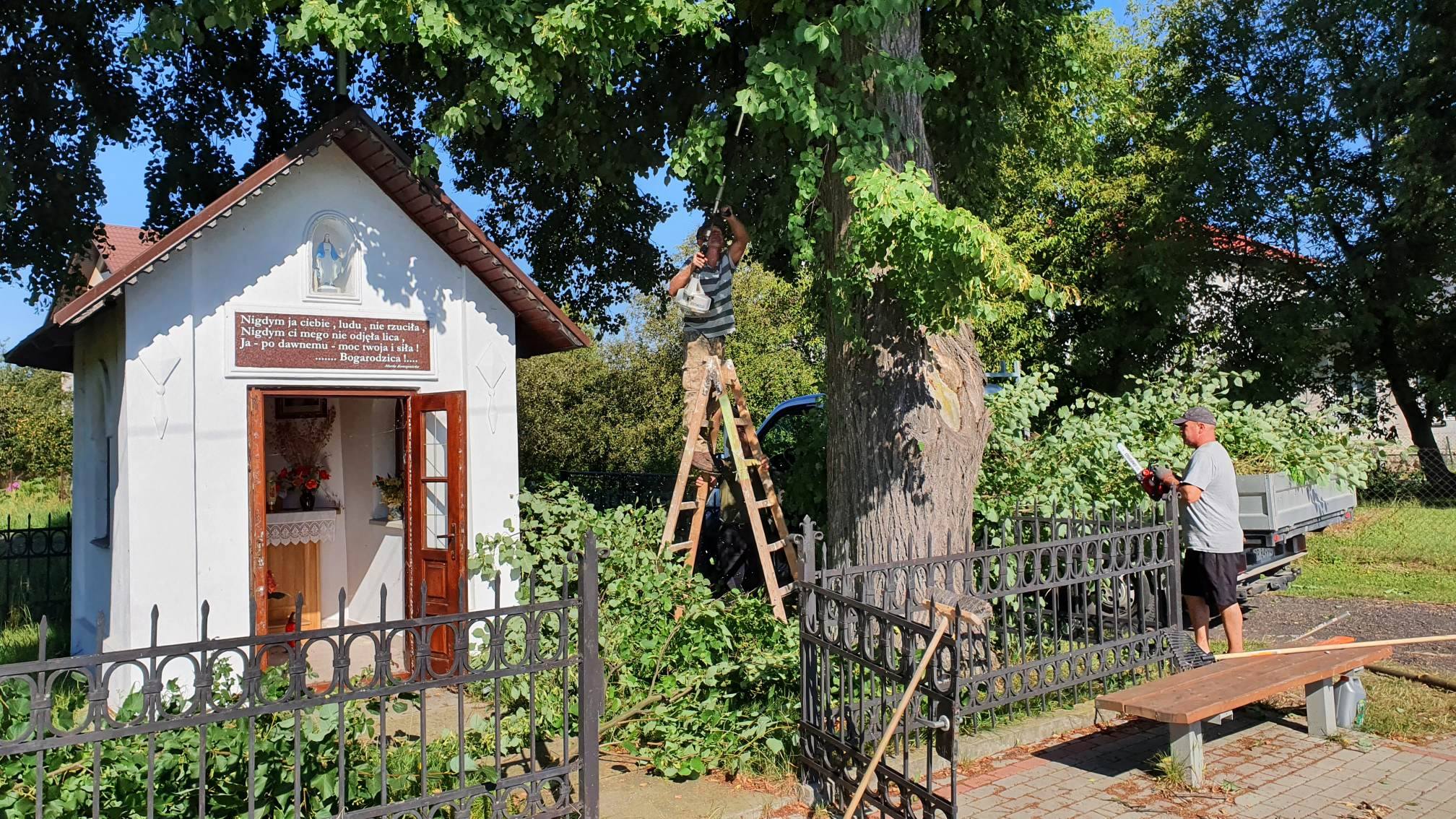 Największy zakres robót został zrealizowany podczas prac renowacyjnych przy kapliczce obok szkoły podstawowej. Aby móc przystąpić do działania należało najpierw kompleksowo przyciąć gałęzie drzew, które dość mocno zasłoniły sam obiekt oraz dzwonnicę.